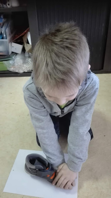 Hij neemt afdrukken van schoenen.